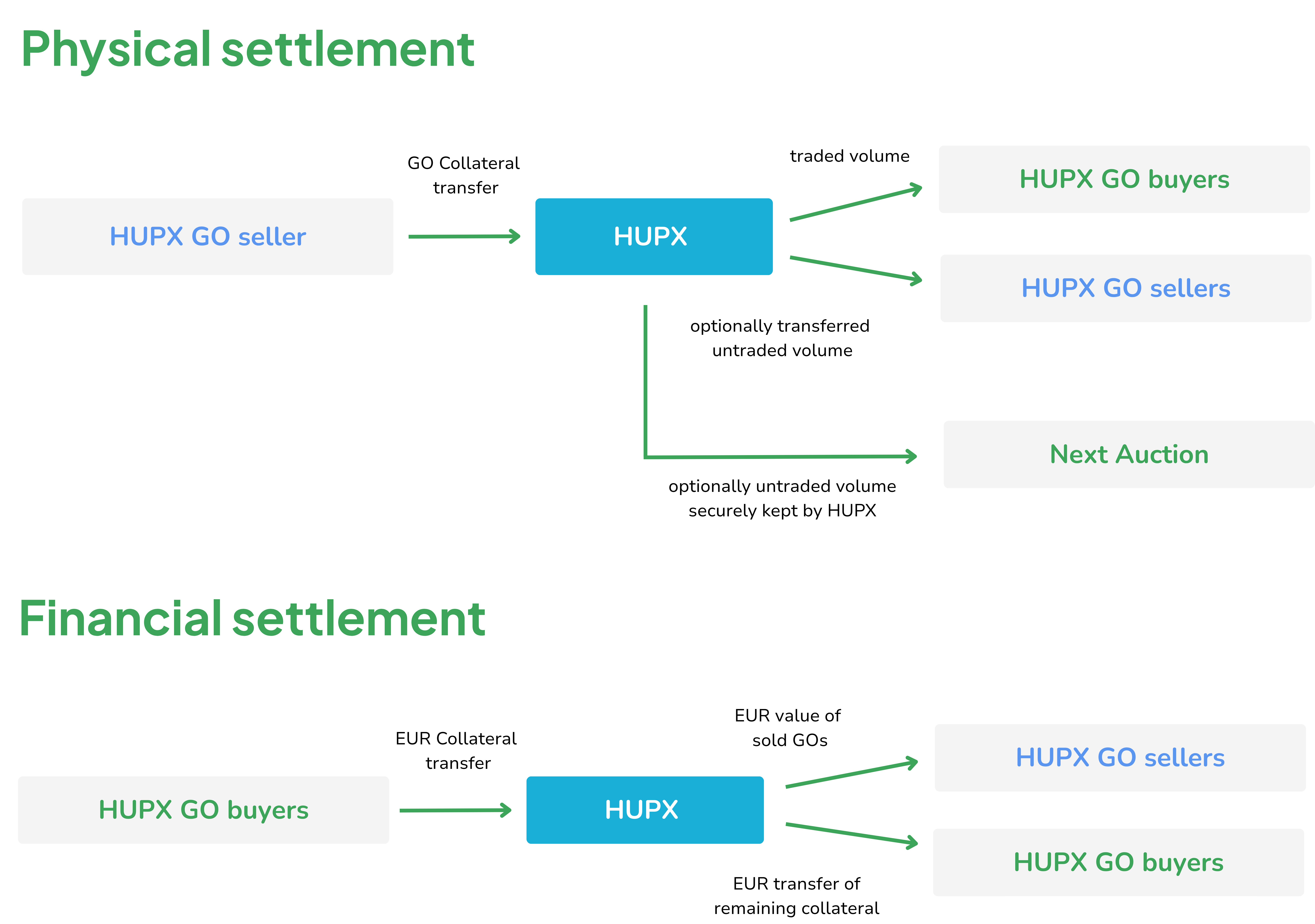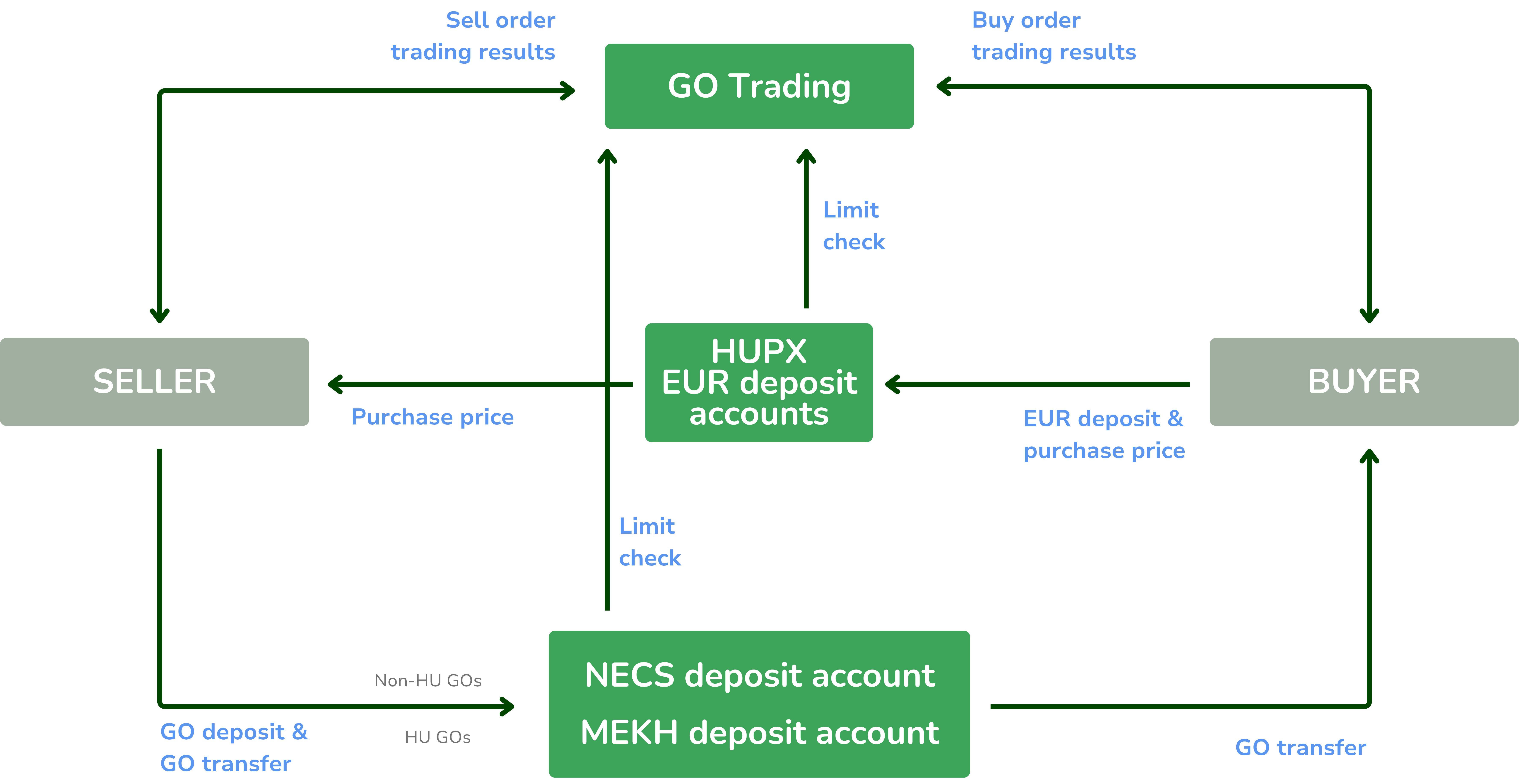- Elszámolás és kiegyenlítés: HUPX technikai GO számlán és HUPX bankszámlákon keresztül