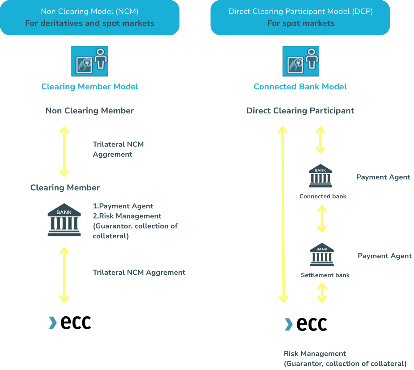 A klíringnek két típusa elérhető: az NCM (Non-Clearing Member modell) és a DCP (Direct Clearing Participant modell) megoldások.